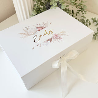 Choose from our gorgeous range of personalised gift boxes - available in different sizes and colours. You can have these boxes personalised with whatever wording you like on the front and inside!